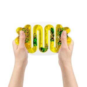 Miękki kolorowy gniotek wypełniony cieczą i brokatem, które płynnie przemieszczają się po specjalnym labiryncie. Wystarczy lekko go ścisnąć, by zobaczyć, jak błyszczące drobinki poruszają się w hipnotyzujący sposób, tworząc efekt uspokajającego przepływu.